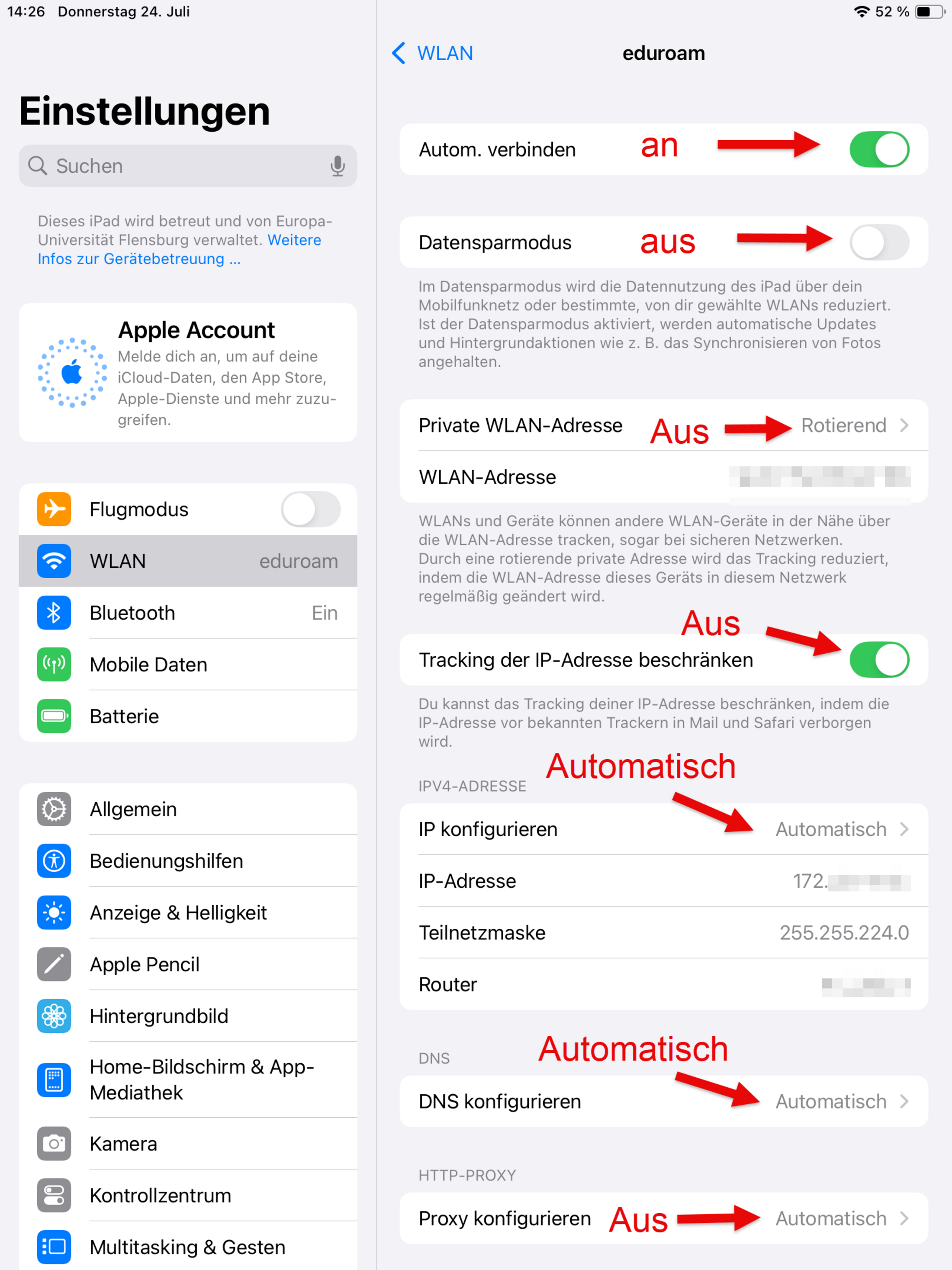 - Einstellungen automatisch erkennen aus ist