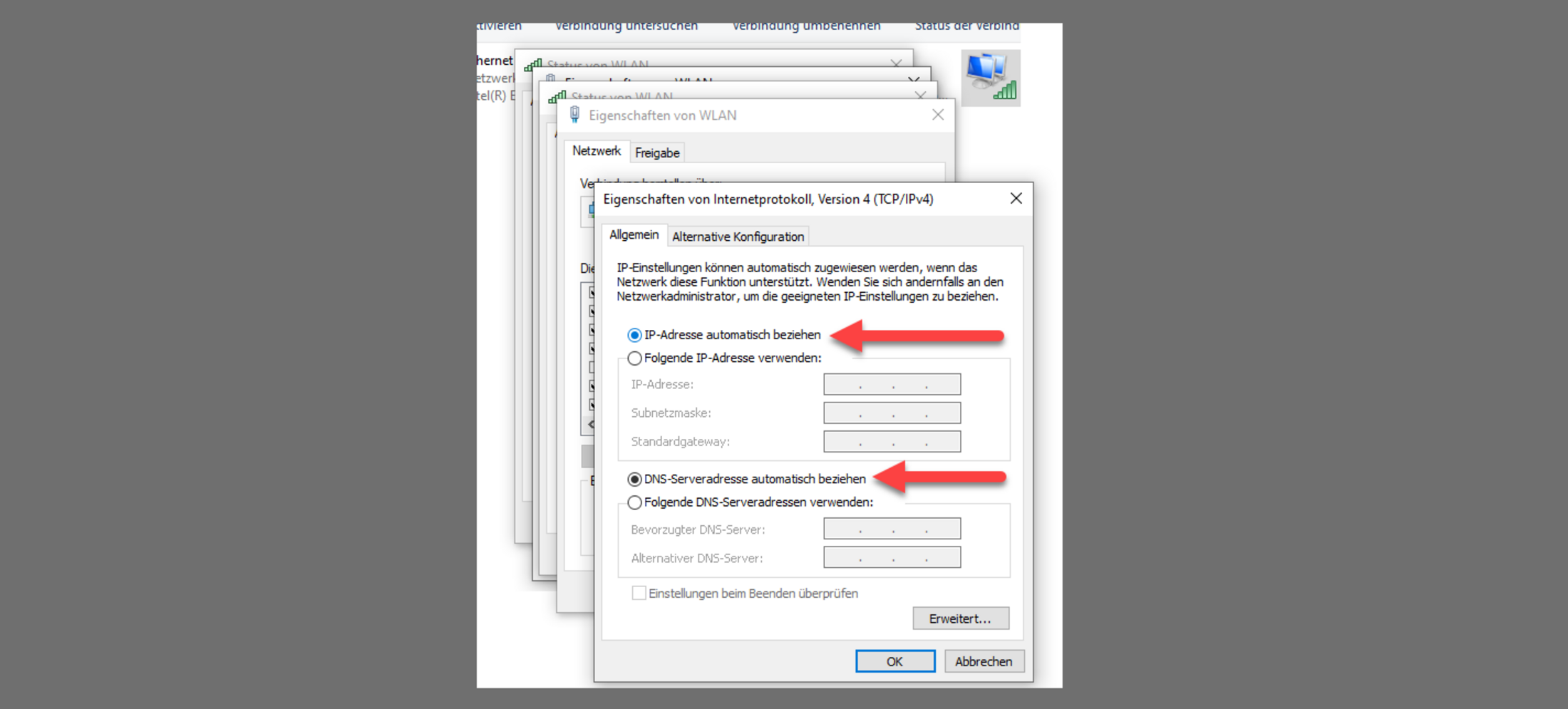 Stellen Sie sicher, dass die Optionen “IP-Adresse automatisch beziehen” und “DNS-Serveradresse automatisch beziehen” ausgewählt sind. Bestätigen Sie mehrmals mit OK.
