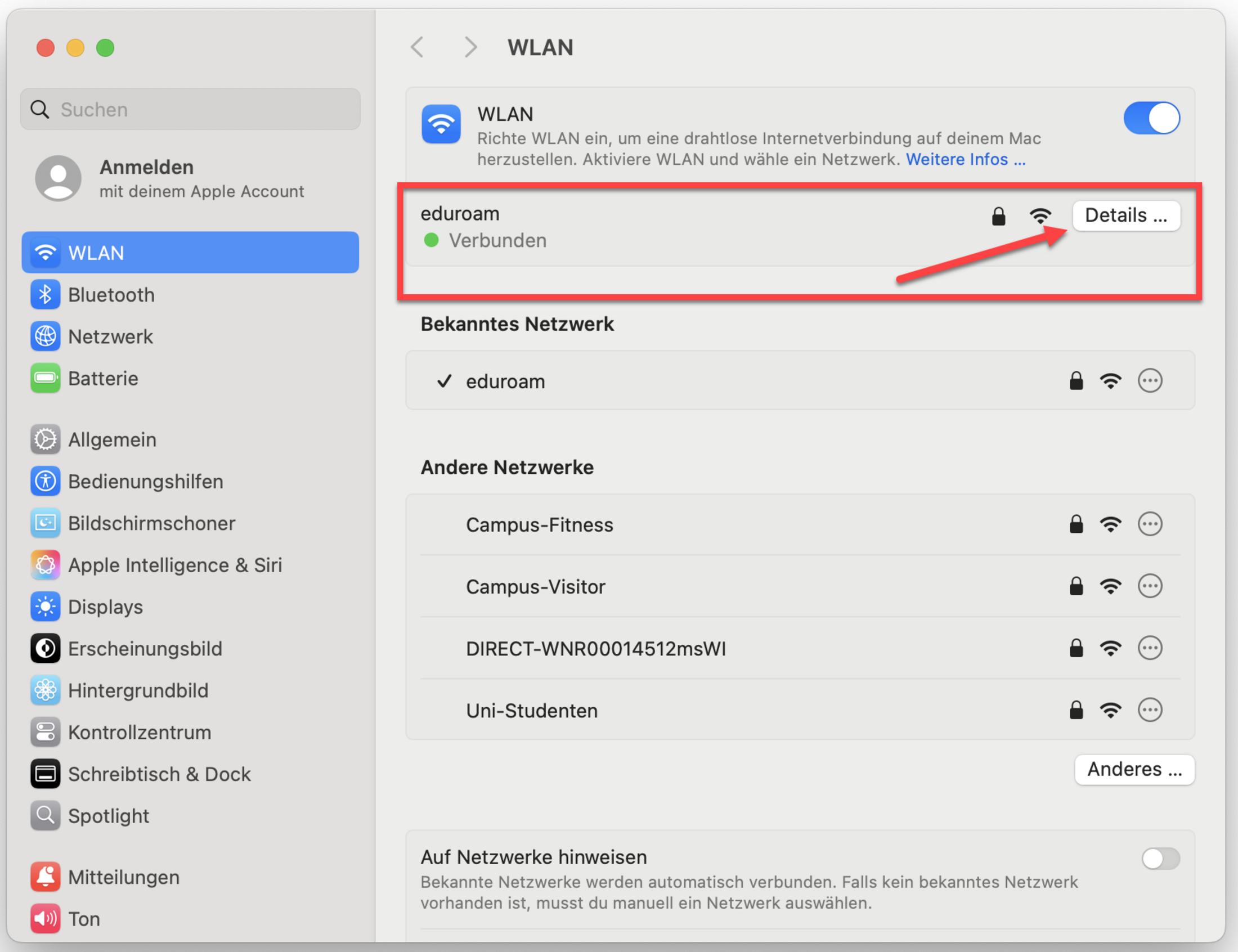In den WLAN-Einstellungen, klicken Sie auf das "(i)" neben dem eduroam-Netzwerk.